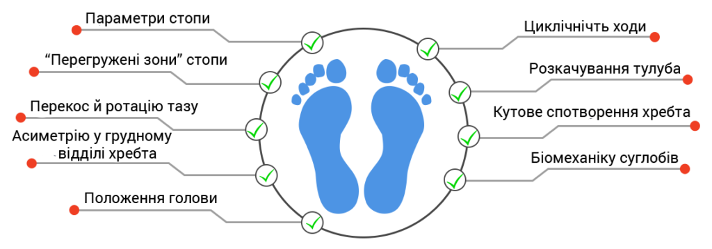 як рухається нога, як розподіляється вага на різні ділянки стопи для досягнення рівноваги.